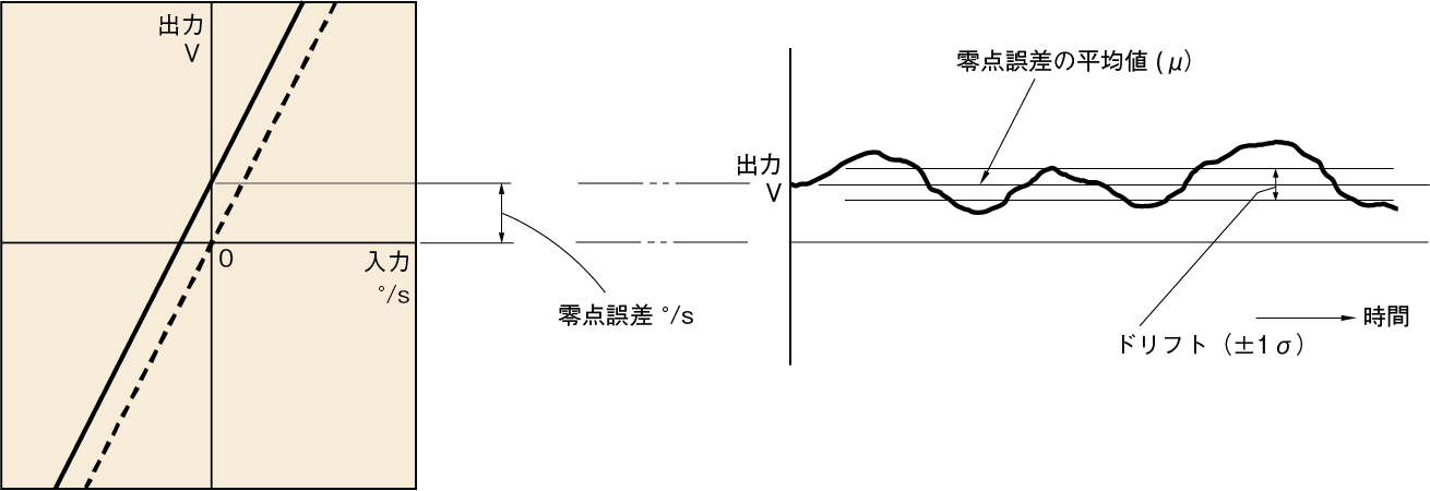 ジャイロ静止時(入力角速度=0)の出力を零点誤差といいます。