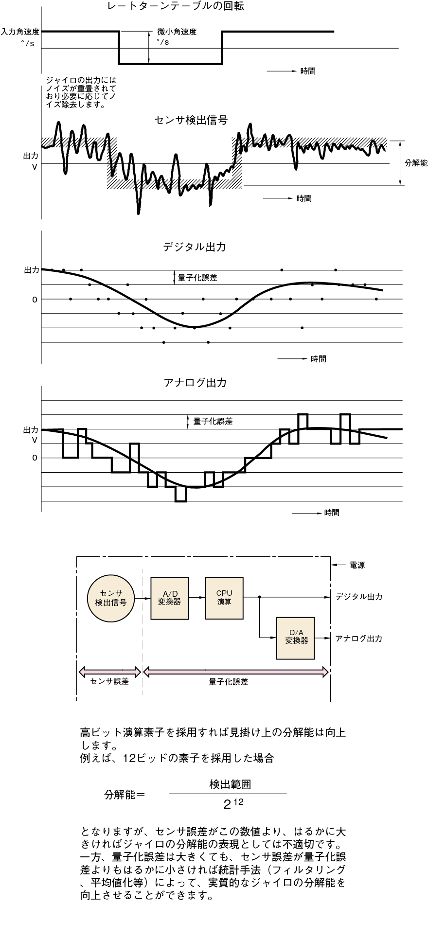 分解能はジャイロが識別可能な最小入力(角速度)です。 分解能を計測するには精密レートターンテーブルにてジャイロに微小角速度を入力し、ジャイロ出力の有意な変化をみます。 最近のジャイロでは量子化誤差を分解能と解釈する場合もあります。